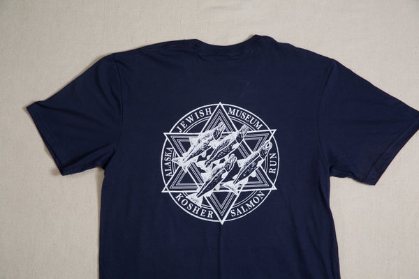 Salmon logo on front and “Alaska Jewish Museum Kosher Salmon Run” design on back. Check on color and size availability by phone or email